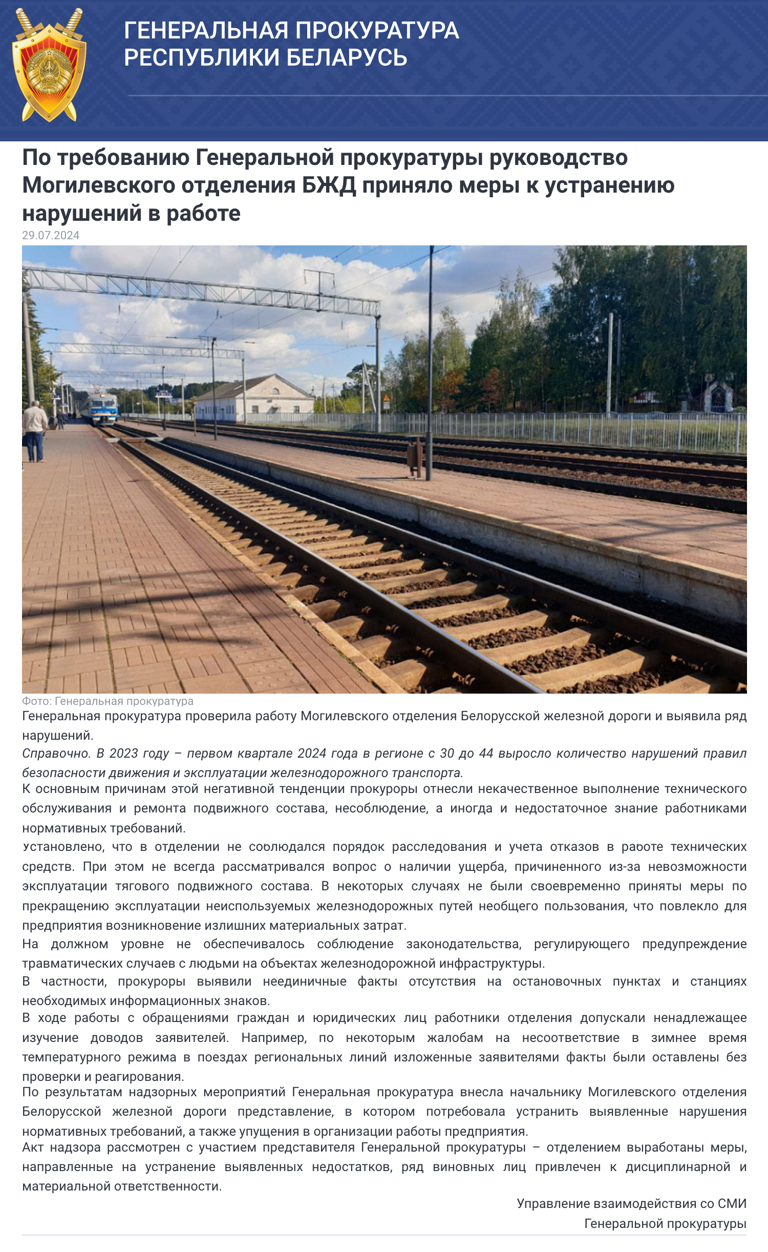 Удивительно, но не только мы отражаем недостатки и откровенно преступную халатность и безобразие на БЖД. Недавно даже «лукашенковская» генеральная прокуратура «озаботилась» происходящим в своем представлении начальнику Могилёвского отделения БЖД. Правда, мягко указали на недостатки там, где давно пора уголовные дела заводить. Но косвенно подтвердили, таким образом, и нашу критику.