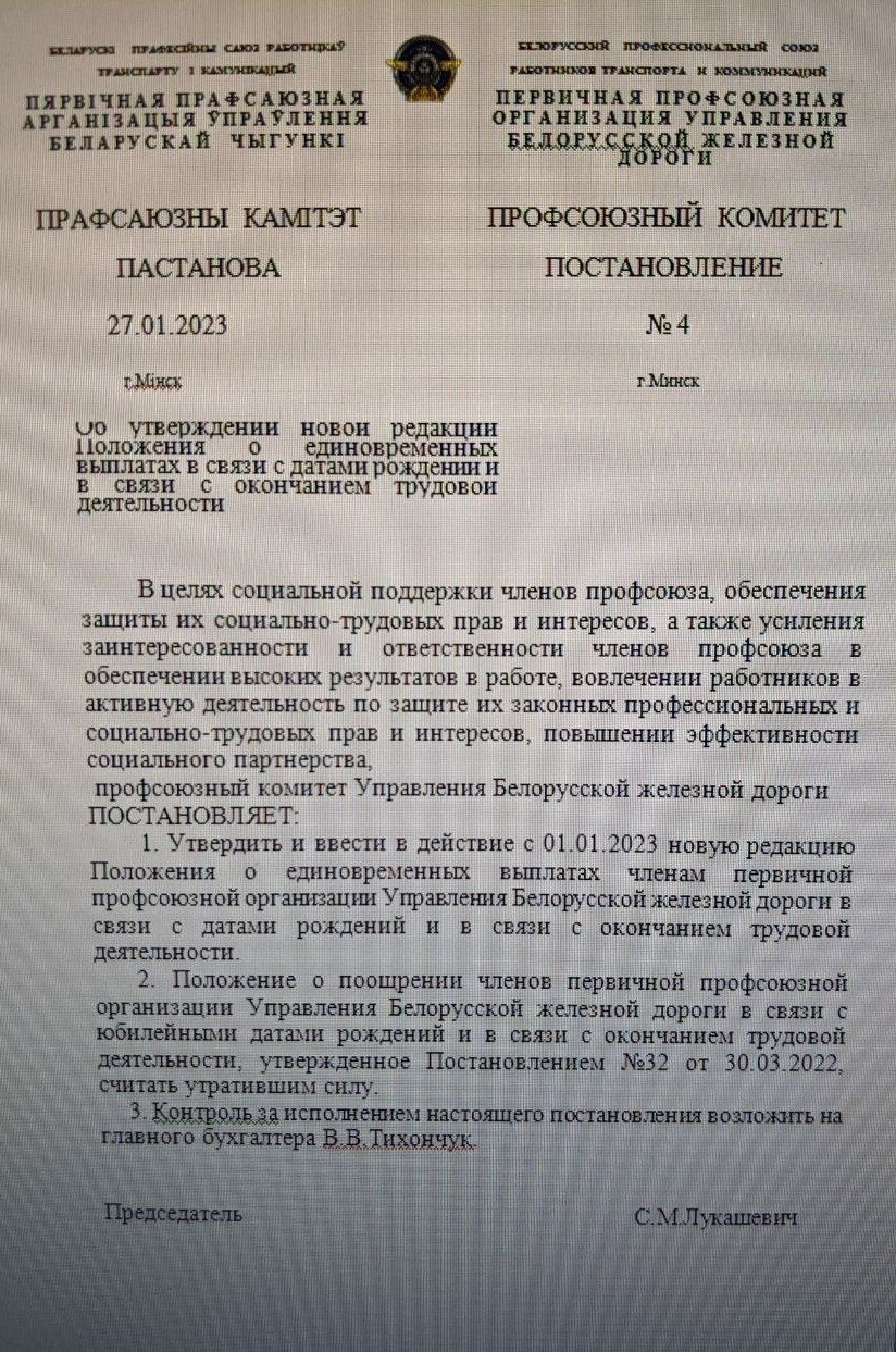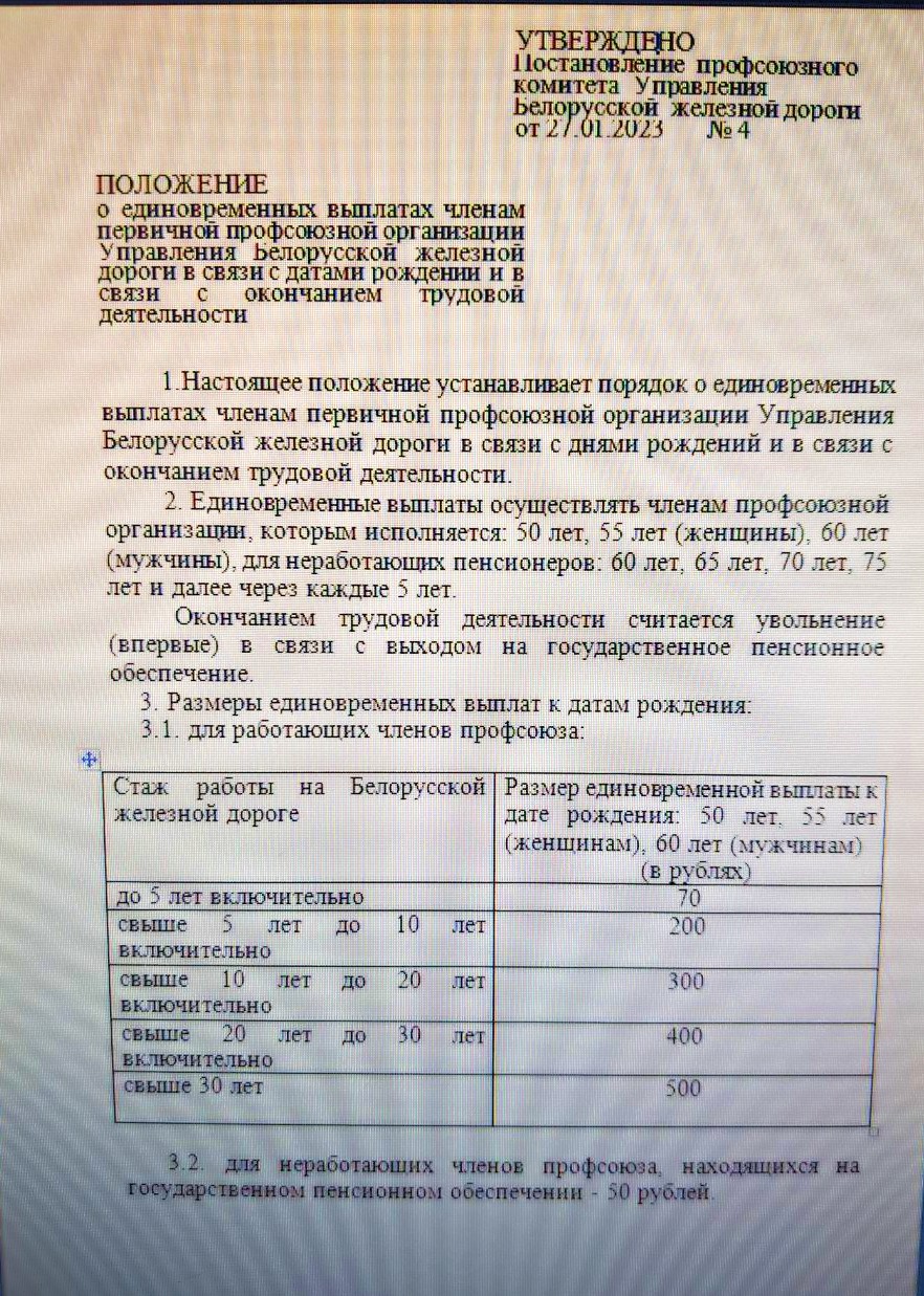 Из недавних изменений в коллективный договор хотелось бы отметить отмену выплат к юбилейным датам 50 и 60 лет в размере должностного оклада и замену на “равноценную” денежную сумму 60 и 100 бел. руб. соответственно. Ну а выбор между букетом цветов или 100 бел. руб. при выходе работника на пенсию вообще можно отнести к разряду тонкой насмешки над ветераном труда —  пенсионером.